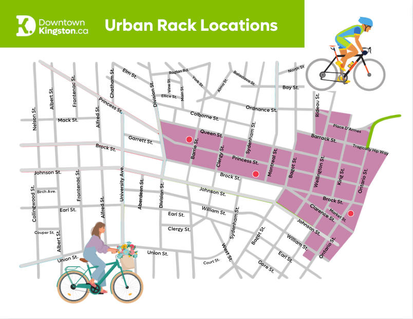 Feel secure when you lock your bike up in downtown Kingston. Urban Rack secure bike docks are can be found at the following locations: